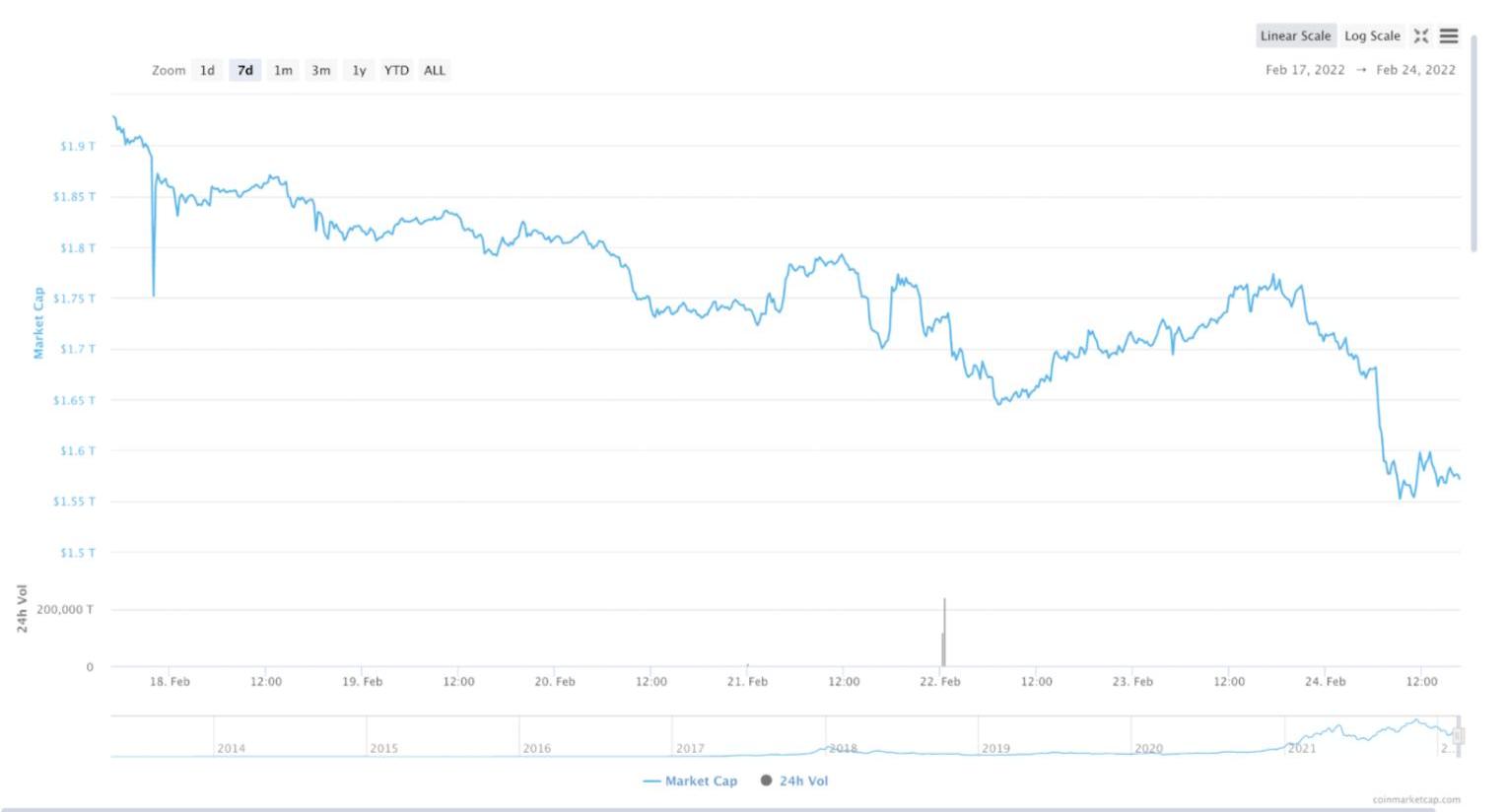 危機爆發,俄羅斯進攻烏克蘭對全球經濟產生了巨大影響。傳統行業和加密貨幣行業都受到了新戰爭陰云的影響。下圖顯示了過去一周加密貨幣的下跌趨勢。