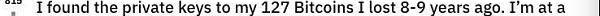 同時這個上漲的價格也不斷創造著新的財富神話。有一位程序員今天在reddit上發帖表示他找到了多年前通過觀看視頻和完成在線隨機任務免費獲取的127枚比特幣。在比特幣價格上漲之后,他從放在車庫中的舊戴爾電腦中找出了這個名為“Keys”的txt文件,并于1月3日以34000美元的價格賣出了全部127個比特幣。