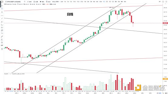 日線上跌破前期上行趨勢線后,這段時間一路震蕩下跌,價格從跌破點到昨日最低,區間跌幅超36%,最低點剛好打在前期弧形底頸線位附近,同時也是90日線支撐區域,今日迎來超跌反彈,相比其余主流幣強勢,日線目前陽線,短線抄底資金入場明顯,4小時仍處于下降通道內,下沿附近接連出現下插針形態,近期延續反彈的概率大 第一壓力350美元。