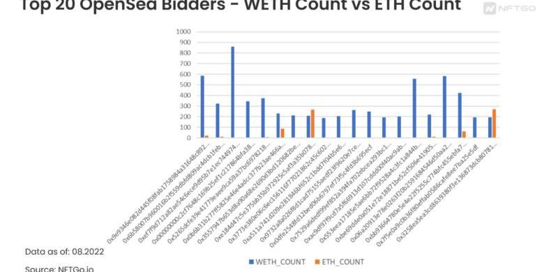上圖顯示了OpenSea上WETH交易量最高的前10個NFT系列。以上系列中,10個系列中有9個是藍籌NFT,OpenSea上大多數競標者都專注于交易量高的藍籌收藏品。