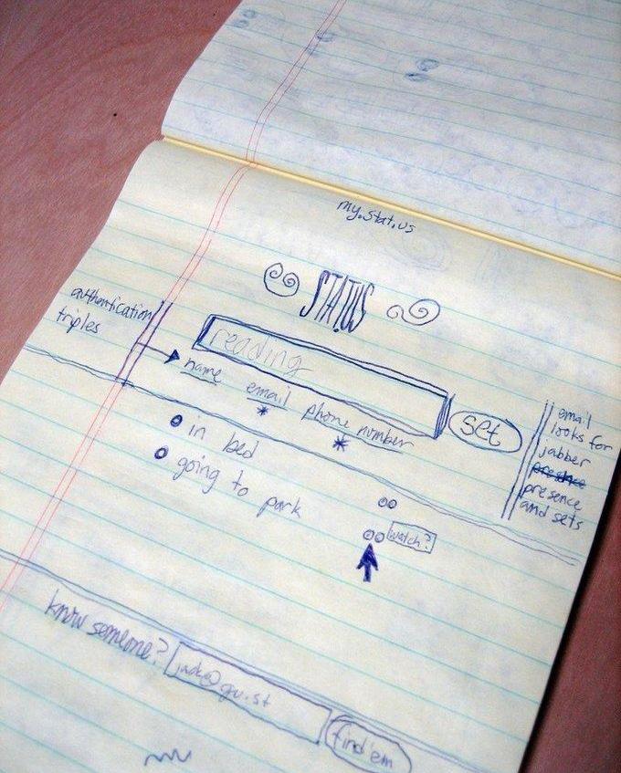 Odeo的聯合創始人NoahGlass注意到了JackDorsey,認為他是公司的“明日之星”。Dorsey有一個與眾不同的新點子:Stat.us,它能讓用戶看到朋友們在做些什么。這個安安靜靜的設計師在加入Odeo前,就在紙片上描繪出了Stat.us。現在,他與Odeo的同事,在舊金山公司附近的操場,一邊吃著墨西哥菜,一邊分享自己的創意。