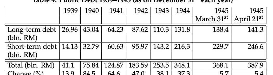 在一篇題為“第二次世界大戰期間為德國經濟融資”的富有洞察力的論文中,作者茲登卡·約翰遜對扣押資本和為戰爭努力提供資金的措施說了以下幾點:然后,與帝國進行貿易的商人不得不接受,高達40%的商品和服務付款是以無息稅單的形式的形式進行的。這些憑證本來可以用于將來向國家支付納稅義務,并且還提供了稅收優惠。這種債務工具同時解決了幾個問題——政府獲得了非常優惠的貸款,減少了現金支出,也不必發行那么多政府債券。經過半年的監管有效期,私營公司“借給”政府近50億馬克。投資私人證券的機會受到成功限制。對于銀行和私人投資者來說,事實上,除了投資之外,別無選擇。1940年,主要是儲蓄銀行提供了80億。RM到該州,次年近130億。到1944年底,三分之二的儲蓄用于證券,其中95%是國有債券。在戰爭期間和戰后,德國都遵循了如何為戰爭提供資金的標準處方。鎖定資本,然后迫使它以微不足道的利率向國家提供貸款。如上所述,個人和企業的扣押資本被強行借給國家。雖然我找不到關于債券收益率和消費者價格指標的可靠數據集,但下面是一張圖表,詳細介紹了公共債務在戰爭期間如何膨脹。我確實發現的一個關于收益率的數據點指出,1939年的收益率平均為3.9%,1942年下降到3.5%。收益率下降,但公共債務增長了4.5倍。通常,當供應急劇增加時,如果沒有需求激增,價格必須下跌。當債券價格下跌時,收益率上升。因此,即使數據很少,我們也可以觀察到政府如何通過迫使公眾將閑置資本“投資”給國家來節省資金,因為收益率較低。