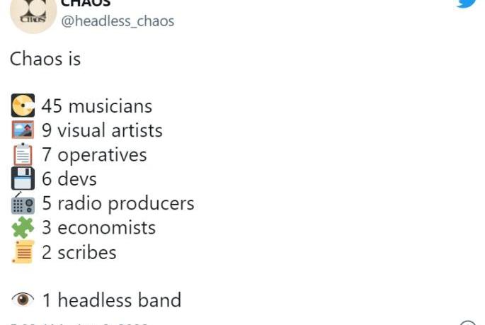 音樂天然就有形成社區的凝聚力,唱片DAO和音樂社區是Web3音樂賽道中重要的人才搖籃,雖然現在還尚不成熟,但也切實地在用Web3的方式培育人才、創建社區以及創新商業模式。2.5.1SongcampSongcamp就像是Web3音樂創作的黑客松,啟動于2021年3月,以每年兩個活動的節奏進行,至今共有3個活動:CampGenesis,CampElektra以及Chaos,這里我們主要討論最新的活動Chaos。Chaos作為Songcamp的第三個活動,比之前兩個活動的范圍更大,于2022年3月啟動。它是一個八周的音樂創作實驗,80位參與者來到SongcampDiscord中進行音樂創作,組建一個headlessband。Chaos中包含7個團隊:音樂、視覺、運營、開發、電臺博客、經濟模型設計以及跨職能團隊。