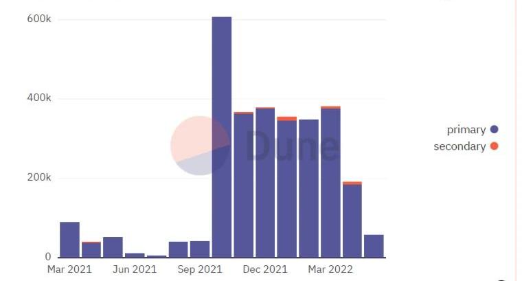 來源:DuneAnalytics2.2.2Catalog—將收益返還音樂家Catalog是一個基于Zora協議的1/1音樂NFT交易平臺,所有NFT都沒有mint副本,支持拍賣,到目前為止,總銷售額獎金300萬美金,1311個NFT被mint,平臺上有373位藝術家已經mint,73%的藝術家賣出了自己的作品,平均售價為3450美元,交易量在21年10月達到頂峰60萬美金,目前大概在20萬美金左右,還比較早期。Catalog平臺基本不抽成,藝術家獲得首次售賣的收益,二次收益分成藝術家可以自己決定,主要支持獨立的對加密貨幣有了解的小眾藝術家,Delphi的報告指出藝術家在Spotify的受歡迎程度和Catalog上的銷售情況相關性不強,比如巴巴多斯說唱歌手HaleekMaul在Catalog上賣出了總計超過100e的音樂NFT,他每個月在Spotify上月流量大概只有4k,這也應證了NFT可以切實解決音樂人的收入問題。Catalog月交易量:
