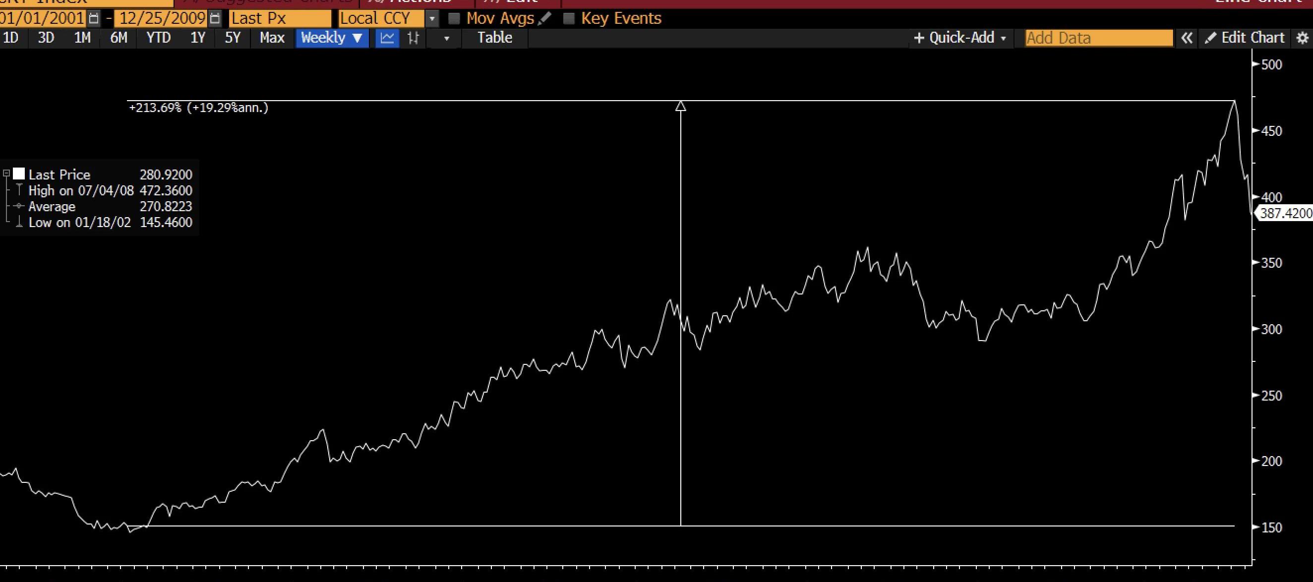 但商品供應問題是真實存在的,因此當需求恢復時,價格也會相應上漲,但同比保持增長的可能性很低。我們在2001年到2008年看到了類似的情況,當時中國的需求沖擊導致大宗商品價格出現爆炸式增長,最高漲幅達215%。