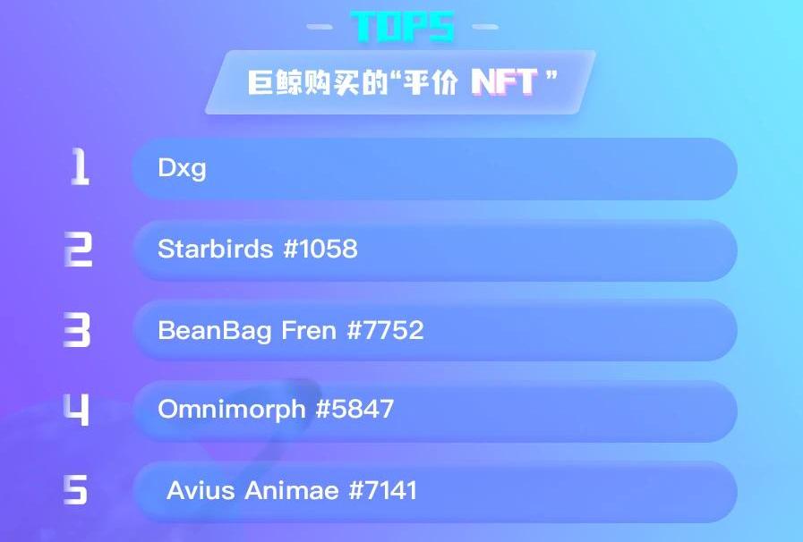 過去24小時,巨鯨購買的“平價NFT”中排前五的分別是:Dxg、Starbirds#1058、BeanBagFren#7752、Omnimorph#5847和AviusAnimae#7141。