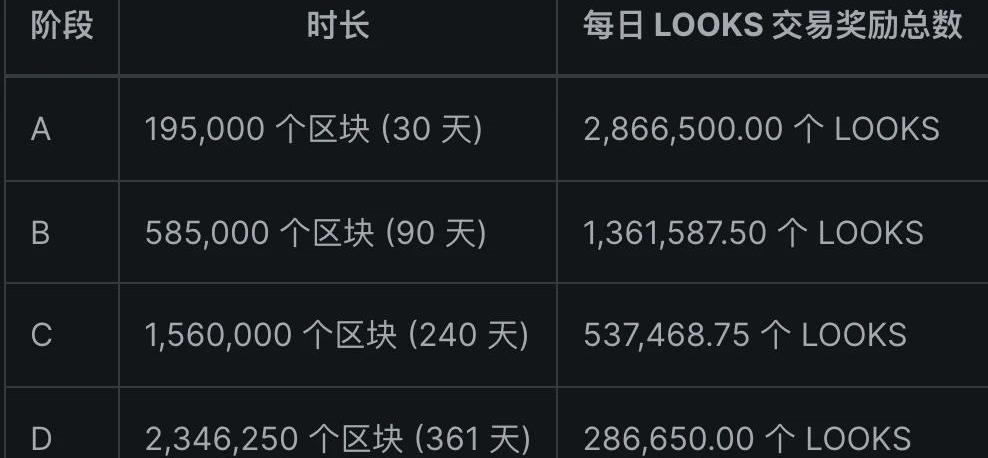 LooksRare在上個月發展市場和吸引新用戶方面表現非常出色,盡管其增長的關鍵驅動因素可歸因于獎勵系統的成功和豐厚的回報。許多促使用戶轉移到LooksRare交易的激勵措施都與這個系統有關。但這頁代表著,如果刷量者明天完全停止交易,那么LOOKS市場的快節奏增長會受到阻礙。LooksRare上線已經將近30天了,根據LooksRare文檔,其馬上從LOOKS交易獎勵的A階段轉化到B階段。這在上周引發了許多令人擔憂的推文和Discord內的辯論,希望以下內容可以讓大家清楚一些事情。