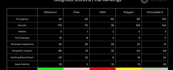 吞吐量由于可以量化,所以結果很直觀。ImmutableX的TPS能達到9000,Polygon7200TPS,WAX4000TPS,Flow100TPS,Ethereum15TPS。接下來,我們來評估安全性。ImmutableX所處的Starkware-builtL2可以提供接近以太坊的安全性,但是也會有所不同,這就是為什么它排名第二。鑒于其無權限的約100個驗證節點,Polygon位居第三。Flow排在第四位,盡管目前是高度集中的。正如我們之前提到的,隨著時間的推移,Flow可能會變得更加分散,我們認為,與WAX所依賴的21個驗證節點的EOS相比,DapperLabs團隊可信度更高。**錢包:**盡管增加對錢包的兼容性相對容易,但仍對用戶體驗有重要的直接影響。Polygon在這里排名第二,因為它目前支持大多數錢包,盡管用戶需要做一些額外的配置。ImmutableX可以支持任何以太坊錢包,且用戶的負擔最小,但由于目前只有MetaMask可用,我們不得不暫時將其排名第三。我們決定將WAX排在Flow之前,因為他們已經建立了一個非常直觀的云錢包,而Flow似乎仍然只提供托管解決方案。**法幣業務:**鑒于大多數人還沒有用加密貨幣進行交易,能否使用法幣可能是主流平臺的首要任務。可以直接使用信用卡支付是NBATopShot成功的一個主要因素,也是Flow排名第二的原因。然而,由于扣款,信用卡支付可能對用戶體驗產生負面影響。Polygon在法幣業務方面排名第三,因為它和以太坊上的流動性互通。考慮到其云錢包的功能,WAX位列第四。我們不得不將ImmutableX在這個類別中暫時排在最后,因為它目前缺乏法幣相關業務,但這很快就會改變。**開發者體驗:**我們根據構建東西的容易程度來評估開發者體驗。許多事情都會影響到這一點,如詳細的文件、可用的Github倉庫、所使用的編程語言、現有的工具等。以太坊居于首位,鑒于強大的EVM兼容性,Polygon緊隨其后。根據我們采訪的開發者,之后的排名順序應該是Flow、WAX和ImmutableX。值得注意的是,CAIRO是一種非常新的語言,隨著時間的推移,它的應用應該會越來越廣。生態系統兼容性是指每條鏈利用現有構建模塊的難易程度,以及該生態系統的廣泛集成程度。Polygon的EVM兼容性使其成為第二名中。緊接著是ImmutableX。如前所述,雖然它不像Polygon那樣兼容EVM,但ImmutableX仍然能夠從現有的以太坊生態系統中獲益。EOS雖然與以太坊的生態系統相差甚遠,但仍有其好處,WAX可以從中受益。Flow還沒有相同類型的開放生態系統或外部市場支持,所以排在最后。**NFT“品牌效應”:**我們認為,現有的品牌力量是吸引新IP到一個特定平臺的重要因素。因此,鑒于NBATopShot的巨大成功和他們賽道中的其他IP,Flow是第二名,排在Ethereum之后。ImmutableX緊隨其后,它已經吸引了幾個強大的游戲品牌。接下來是Polygon,因為它已經能夠吸引幾個DeFi藍籌股和Aavegotchi等NFT項目。最后是WAX,除了最近的ToppsMLBNFTs,它未能吸引任何有影響力的品牌力量。WAX歷史交易量較低,這反映了它主要托管廉價和質量較差的產品,這直接導致它們吸引了較少的資本和市場。**資產流動性:**最后,我們將資產流動性定義為NFT可以從一條鏈轉移到另一條鏈的容易程度。從技術上講,ImmutableX可以在不犧牲安全性的情況下,提高以太坊上NFT的流動性。其次是Polygon,它的PoS鏈的NFT提取可能需要30分鐘。我們把WAX排在第四位,因為他們正在積極建設一個通往以太坊的橋梁,這已經在他們的路線圖上有一段時間了。Flow的雙向橋計劃仍不清楚,所以排在最后。**PS:**這些評分因素之間并不都具有可比性,并非所有的因素都同樣重要,有些因素改進起來要更難。例如,對于一個解決方案來說,增加他們支持的錢包比突然提供更好的安全性和更大的吞吐量要容易得多。后者可能需要對設計架構進行徹底的修改和重建。考慮到這一點,我們開始對這些因素本身進行排名,以便我們可以使用權重來調整之前的分數。最終得到一個更加準確的評分表,如下所示。