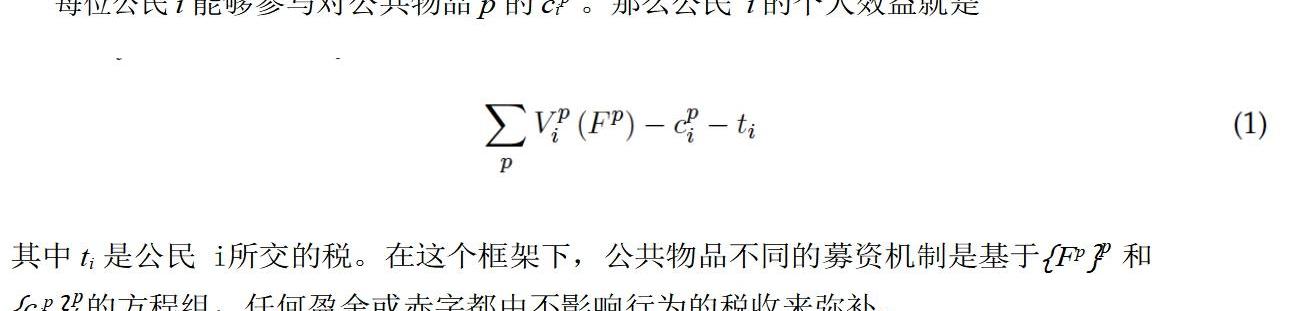 我們為社會選擇資助哪些公共產品開發了一個靈活的模型。考慮一個由N個公民組成的社會i=1,...N;在接下來的內容中,我們假設我們可以可驗證地區分和識別這些公民,盡管我們將討論他們可能串通的可能性。我們使用術語“社會”來指代所有參與者的集合,使用“社區”一詞來指代為特定公共物品提供資金的團體;然而,在許多應用中,相關的“社會”本身就是一個更廣泛環境中的社區。存在一組潛在的公共物品P。我們不對這個集合的性質做任何假設。特別是,公共物品的集合沒有必要在外部或預先指定;任何公民都可以隨時提出新的公共物品。我們表示一個典型的公共物品p∈P。3.1個人偏好與行為如果公共物品p的資金值是Fp,設Vip(Fp)是公民i收到的貨幣等價效用。我們假設所有公共物品都為公民產生獨立的價值,并且公民具有以貨幣單位計價的準線性效用。我們還假設了一個完整信息的設置,盡管考慮到問題的靈活設置,我們的結果并不嚴重依賴于這個假設。我們還從關于可觀察性和貢獻時間的問題中抽象出來。我們在這里的興趣是最大化美元等值的價值,而不是實現價值的公平分配。為了簡化下面的分析,我們假設所有函數V都是凹的、平滑的和遞增的。如果沒有這些假設,可能會出現一些復雜情況,但是對于目前更容易從它們中抽象出來的主要論點來說,這些都很次要。