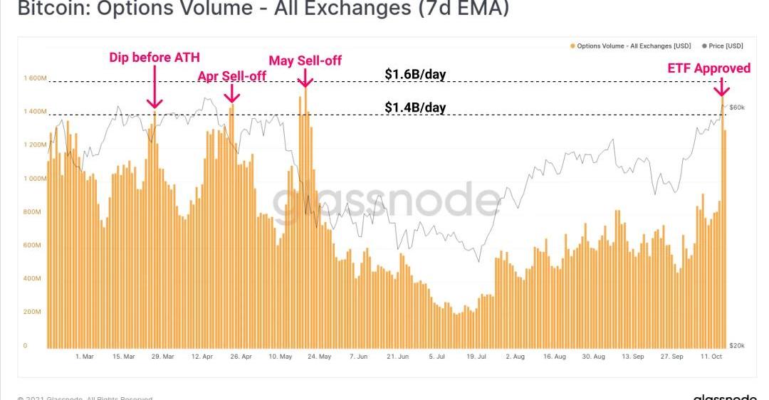 期權交易量同樣經歷了非同尋常的一周,隨著比特幣價格突破6萬美元,期權的7天指數移動平均值上漲至15億美元。下圖顯示,期權交易量僅在之前的三個場合達到過如此高的水平,即今年3月至5月期間,比特幣均處于相似的價格點。
