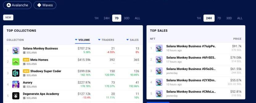 不可否認,數量暴增的NFT生態參與者中或許會摻雜著“逐熱金”的投機者,但我們也應該看到Solana公鏈自身性能對他們的強大吸引力。Solana在創立之初意圖打造“第四代區塊鏈”,相對于前輩以太坊來說,它兼具便宜、高TPS、去中心化、可大幅拓展的優點。對于NFT項目構建來說,甚至不需要任何費用,所有工具都開源免費的向開發者開放,參與者可以免費創造NFT藝術品并建立社區,這給了不論是項目方還是藝術家可直接繞過昂貴畫廊展覽的底氣,直接提供了一個低門檻參與的渠道和平臺,且Solana提供的全球范圍內拓展工具可以滿足不同規模項目方的開發需求,是即可小而美,又可大而全的基礎設施開發平臺。縱覽Solana上的NFT項目構成來看,生態雛形大致涵蓋基本面,既有NFTGaming、NFTSocial類,又有NFTMetaplex等。而種種數據顯示,在Solana公鏈之上構建的NFT項目也在不斷創造著新成績,據CryptoSlam的數據顯示,自8月初到現在,基于Solana的NFT的二級市場銷售額已破5億美元,在這三個月時間中,Solana在九月份表現亮眼,創造了1.894億美元的銷售額,雖然這與同月的以太坊22億美元銷售額無法同日而語,但對于Solana來說,已經算是突破性新關口了。從項目銷售額排名來看,來源于DappRadar最近七天銷售數據顯示,基于Solana公鏈的SolanaMonkeyBusiness、DegenetateApeAcademy和ShadowySuperCoder項目分別排列前三,第一位的銷售體量有600多萬美金。種種數據表明,Solana的NFT生態正在不斷發力,并憑借非常多的項目實踐實現多維突破。