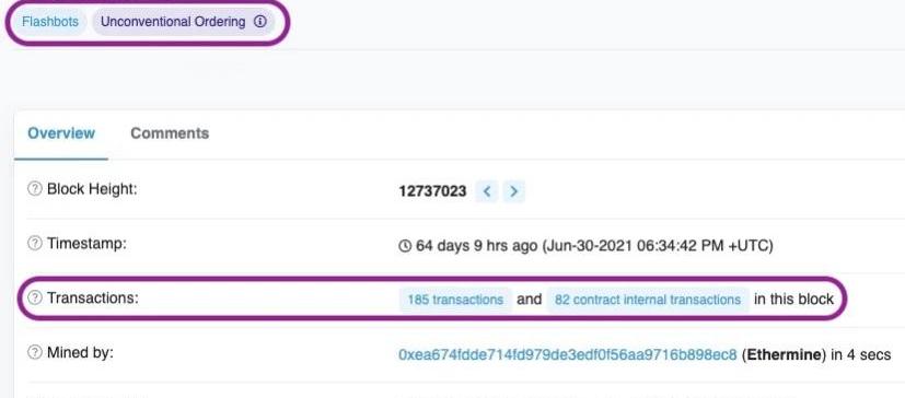 例子<1>:某用戶的交易中包含ETH的兌換。礦工直接從用戶的交易中扣除部分,以任何被交易的代幣作為小費。這個功能不僅對于礦工更民主化MEV,也使交易者在以太坊區塊鏈上民主化交易。例子<2>:對于以太坊區塊鏈的12737023區塊。頂部有兩個標簽:“Flashbots”和“UnconventionalOrdering”。第一個標簽代表Flahsbots技術被用來將幾個交易捆綁在一起。第二個標簽代表這個區塊的頂部位置同時包含常規交易和捆綁交易。這些捆綁交易繞過了以太坊公共內存池,直接發送給礦工,因此這些交易沒有按照Gas費的價格排序。用戶不需要支付市場Gas費或者交易費用。