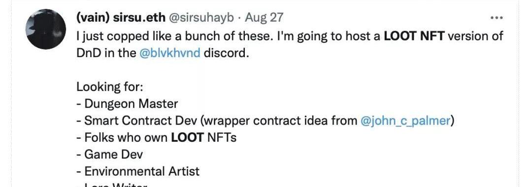 1900/1/1 0:00:00Loot的出現,讓加密社區感到興奮。Messari研究員RyanWatkins表示:Loot是我很長時間以來見過的最令人興奮的NFT項目。這是截至目前真正社區驅動的元宇宙項目中最好的實驗.