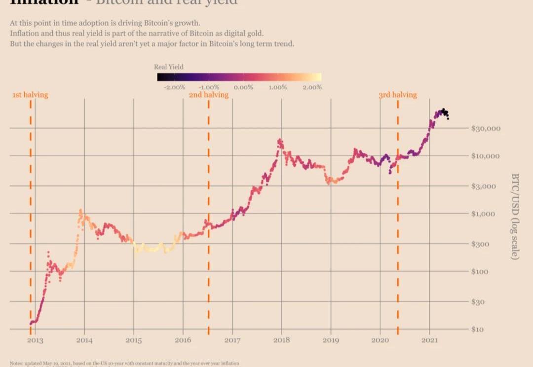 黃金利率和實際債券收益率就比特幣而言,我們(目前)還沒有機會回溯到50年前尋找模式。但正如我們可能懷疑的那樣,在過去三個周期中,實際回報并沒有對比特幣市場產生影響。由于比特幣的采用,需求增加,加上一半的供應減少,是價格大趨勢背后的主要驅動力。你自己看: