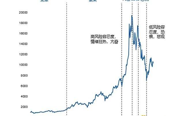比特幣價格的另一個重要影響因素是投資人的風險態度周期變化。根據芝加哥學派的金融理論,看起來有更高風險的資產,必須顯得有更高的風險溢價,否則沒有人愿意做這些投資。比特幣也正是這樣,盡管風險過高,但由于其潛在的高收益,吸引了大量投資者入場。過度風險容忍導致資本市場線變得平坦,過度風險規避導致資本市場線變得陡峭。在市場順風順水的時候,比特幣價格飆升,投資人往往意味未來一片光明,風險是朋友,賺錢很容易,每個人都感覺良好;這意味著只有極少數風險規避包含在定價中,因此這樣的市場價格充滿了危險;同樣,在市場底部時,風險容忍會低到無法再低,人們簡直不允許存在任何風險,以至于投資人在這么低的價格水平買入,虧損完全不可能,但之前市場下跌的刺痛感仍在,讓投資者只想提高風險規避,只愿意坐在一旁觀看,盡管價格處于低水平,人們卻不愿意投資。基于以上原因,比特幣價格經常暴漲暴跌,波動十分大。上一輪的比特幣牛市中我們正能觀察到一個完整的比特幣泡沫周期。根據金德爾伯格的劃分,一個典型的資產泡沫可以分為變革、繁榮、亢奮、困境、恐慌五個階段。在2017年11月至12間,比特幣價格從8,000美元左右躍升到19,000美元的高點,正是市場最為狂熱亢奮的時期。