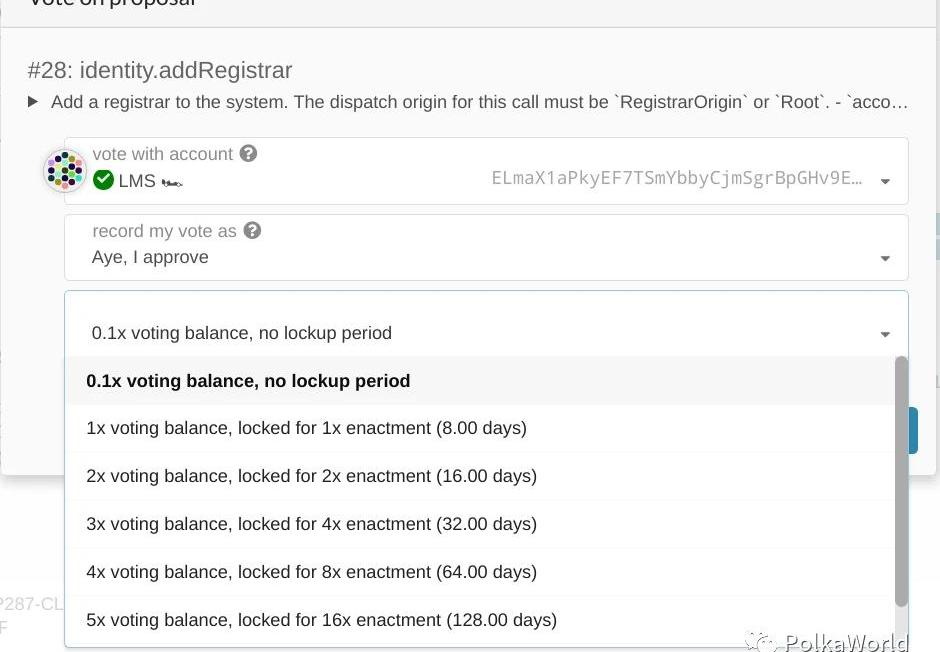 在每個啟動期結束時,支持率最高的提案將轉為公投。在此期間,你可以投贊成票或反對票。你也可以把你的代幣鎖上更長的時間,來增加你投票的權重。在你的代幣鎖定期間,你無法轉移它們,但是它們仍然可以用于進一步的投票。代幣的鎖定是層層疊加的,所以如果你一周后再次投票,8周的鎖定不會變成15周,而是另加一個8周的鎖定期。要對公投進行投票,請導航到PolkadotApp的“民主”欄。任何積極的公民投票都會在“公民投票referenda”一欄中顯示出來。點擊藍色按鈕“投票”,為公投投票。如果你想對提案投贊成票,請選擇“Aye,Iapprove”選項。如果你想在公投中投反對票,你將選擇“Nay,Idonotapprove”選項。第二個選擇是為這次投票選擇你的意愿程度。你愿意鎖定代幣的時間越長,你的投票權重就越大。不愿意鎖定你的代幣意味著你的投票僅占你所持代幣的10%,而256天的最大鎖定時間意味著你可以讓你的投票是你所持代幣的600%。當你對所做的決定感到滿意時,單擊藍色的“投票”按鈕提交你的交易,并等待它包含在一個區塊中。