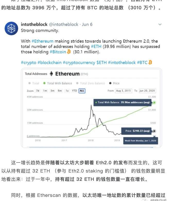 以上,就是我們在“懵懂期”對公鏈的估值方式。基本上還是按照其他領域對投資持倉的估值方式在幣圈“復刻”了一份。沒有很精確,當然,也沒法很精確。那么今天的我們如何對公鏈進行估值呢?現在我們對公鏈的估值,前提是必須有完整的生態,有資本進駐,有足夠多的用戶和開發者,有足夠強大的軟件生態等。沒有完整的生態,估值依然靠做夢和對比,沒啥好估的。在生態強大的基礎上,我們如何給公鏈估值呢?我覺得可以參考目前的手機操作系統,ios和Android。他們也同樣是給生態提供了強大的系統基礎,給了開發者和用戶足夠友好的環境,現在上面的生態價值加起來已經遠遠超過了生態本身的價值。用戶需要的是ios和Android系統嗎?不是的,用戶需要的是微信、支付寶和抖音等等,這才是用戶需要的。所以公鏈提供的是底層基礎,然后如何能從這個生態中“賺取”價值,是這個公鏈代幣價格的主要支撐。比如波場上面印多少USDT都不怎么會影響TRX價格,就是這個原因,因為波場并不能從這件事情上賺到什么收益。當年EOS的DAPP也是這個邏輯,dapp玩的風生水起,但是eos生態并不能仗著這個獲得大量的新用戶,形成用戶粘性,從而賺取收益。ios生態繁榮,蘋果就能借著IOS生態來大量賣手機,相輔相成。好了不吐槽了,總之就是這么個邏輯。當我們在討論生態繁榮的時候,請注意這么一點:這個繁榮的生態是不是給這個公鏈帶來了大量的活躍用戶,并且用戶有粘性有忠誠度,愿意給公鏈貢獻價值?比如這么說吧,我相信每個使用過erc20代幣的朋友,或多或少都有一個或多個以太坊地址,有IMtoken之類的錢包,錢包里多多少少都有那么幾十塊幾百塊的ETH吧?可別小瞧每個人這一點幣,匯集起來的量可是很大的。