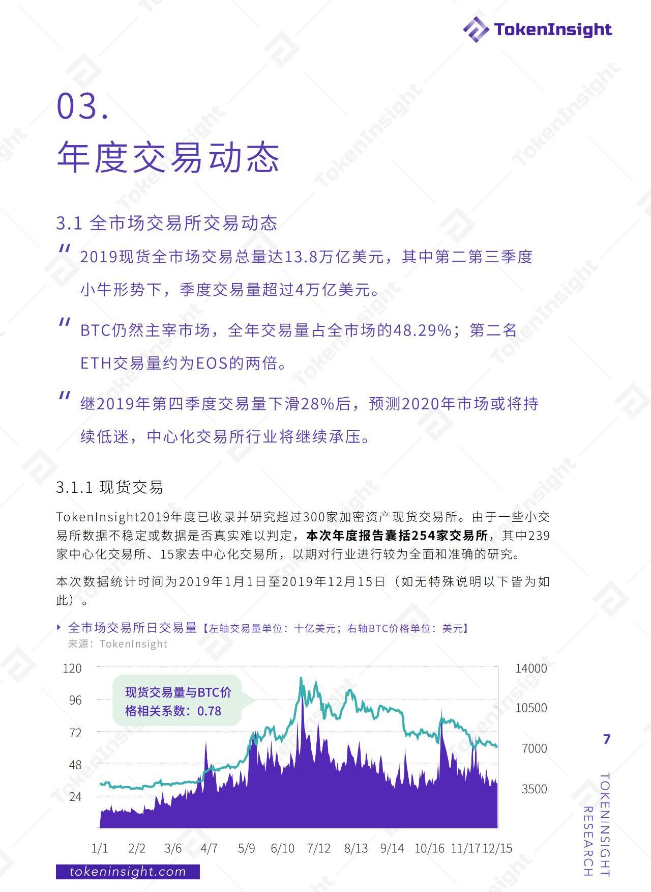 1.全年現貨交易量13.8萬億美元。2.BTC全年交易量占比48.29%。3.ETH總交易量是EOS的兩倍。4.全市場現貨交易量與BTC價格走勢相關性為0.78。5.交易量排名前40交易所總交易量占全市場的82%;全年各交易所報告交易量排名此消彼長,刷量情況仍不容小覷。6.調查的227家交易所中有18%支持USD入金。7.去中心化交易所交易量僅占全市場的0.01%,行業整體仍未成氣候。8.12個國家/地區對數字資產持積極態度。9.繼第四季度交易量下滑28%后,預測市場或將持續低迷,現貨交易所行業可能持續承壓。10.2019年第四季度,獨立訪客數排名前3家交易所分別是Binance、CoinbasePro和Upbit。美國、韓國和俄羅斯是全行業交易所月均獨立用戶最多的3個國家。11.交易所行業的布局針對美國和歐洲地區;各類法幣在細分市場交易所也均有入金通道,數字資產配置門檻在2019年大幅度降低。12.受益于交易所盈利模式較為穩定的和產品特征,平臺幣在2019年多有較為亮眼的表現,但下半年多為價值回歸。若2020年BTC等主流數字資產對無法開啟新一輪的牛市,平臺幣或將受縮量影響延續下行趨勢。