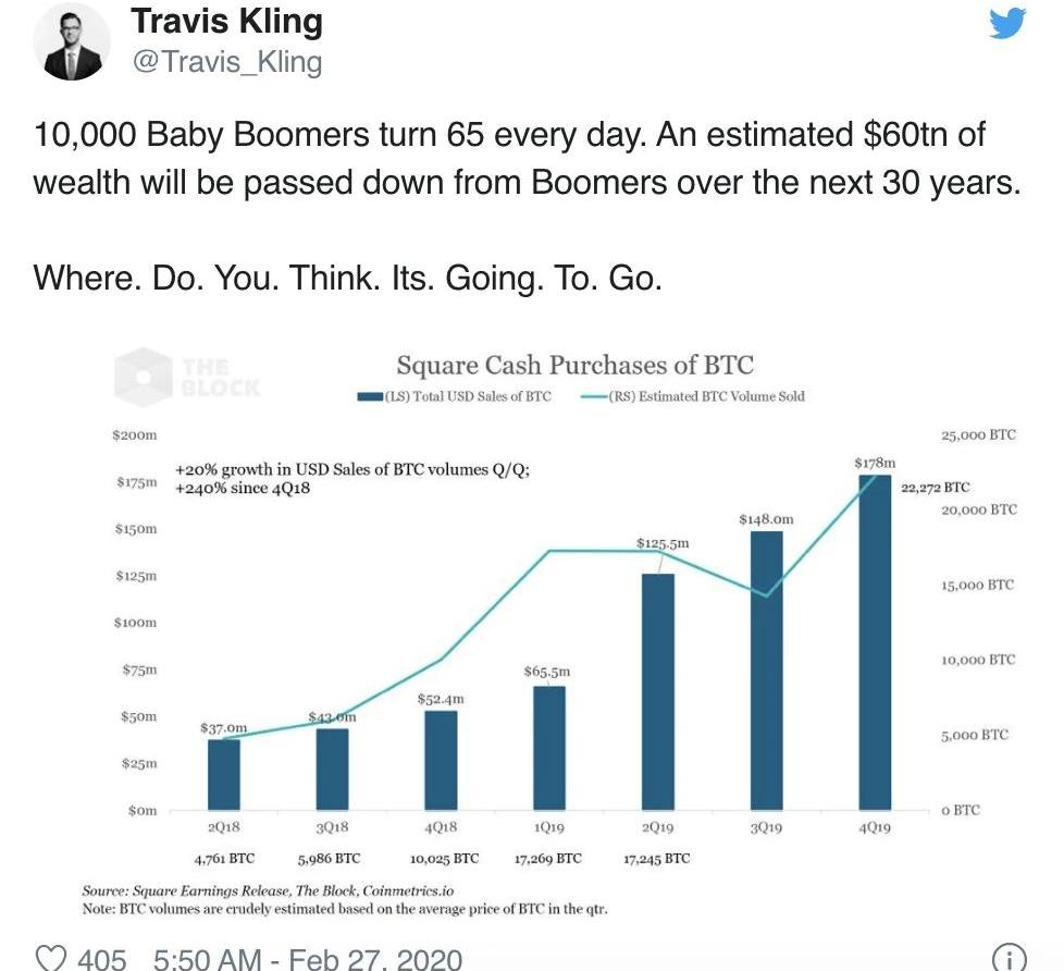 據統計,在未來30年中,估計有60萬億美元的財富將從嬰兒潮一代轉移到千禧一代。嬰兒潮一代的定義為出生于1946年至1964年之間,因此估計每天有10,000人達到65歲。Ikigai基金經理TravisKling提出了一個明顯的問題:“每天有10,000名嬰兒潮一代達到65歲。在接下來的30年中,估計會有$600億美元的財富從這一代轉移下來。你認為這些錢會流向哪里?”