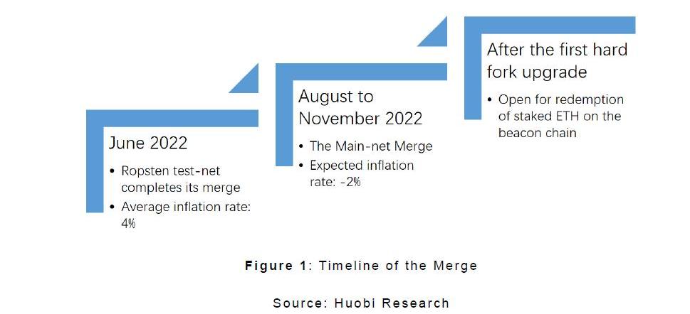 6月9日,以太坊Ropsten測試網完成了合并,這是首次基于測試網的合并實踐。Ropsten轉型后,Goerli和Sepolia也將轉型為POS。備受關注的以太坊主網和信標鏈的合并已經在9月15日完成。合并后,ETH的通貨膨脹率將從4%下降到-2%左右。信標鏈的贖回預計將在第一次硬分叉后立即進行。