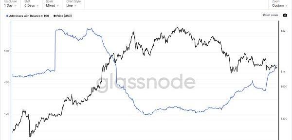 BTC地址數:持幣100以上地址數開始逐步放緩