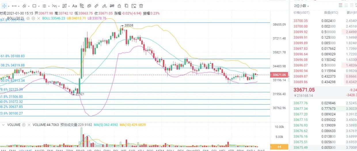 昨日的起漲點位32000,到今日的35000一線已經形成了箱體壓制區間,薪火推測日間會維持在這個區間內震蕩,不會在再有較大漲跌幅。等待晚間行情給出方向。