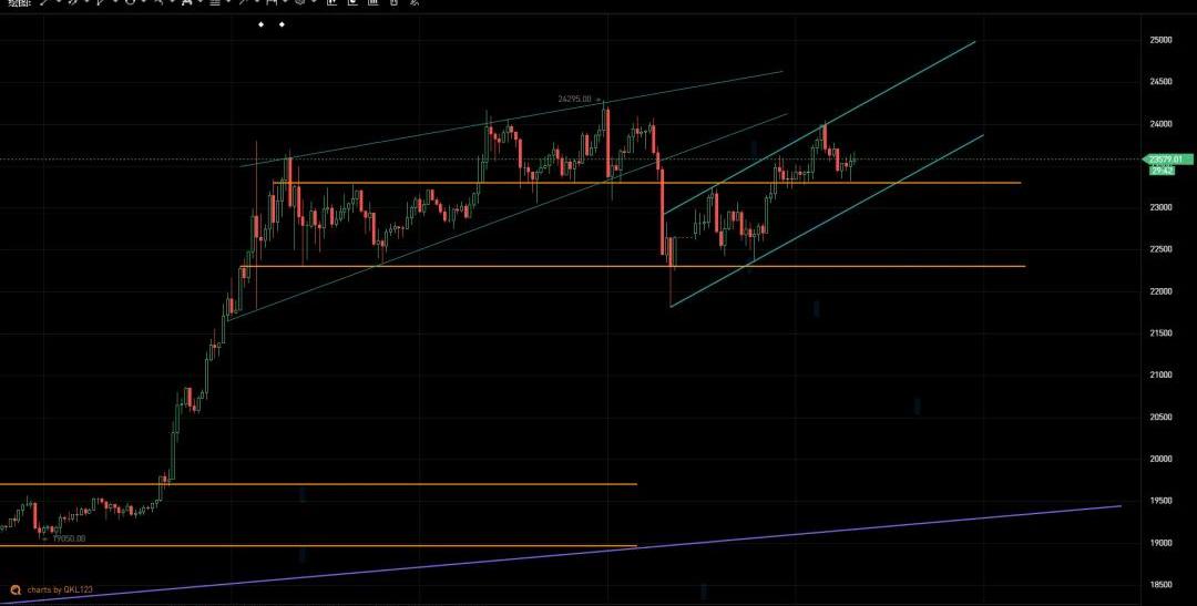 如圖所示,比特幣跌破收斂形態后在23300附近進行初探,隨后跌幅達1500美金,于上期報告中所提22300關鍵位置得到支撐并收線,此后二探確認22300位置支撐強度并突破“碗口”開啟上漲空間,后市重點關注23300平臺以及上漲通道,24000一線仍然是重壓力位,下方短期支撐為22300,中期關注21700附近。