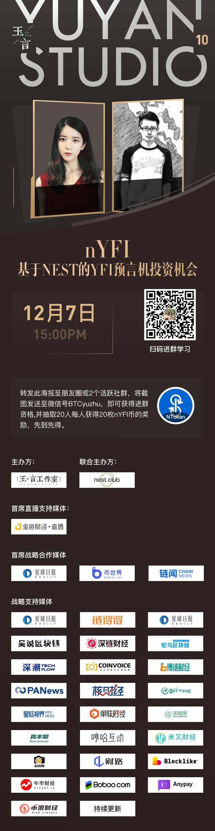 12月07日,“玉·言”第十期,邀請到NESTCLUB的核心發起人Edward,為大家全面剖析YFI/ETH預言機的特點即應用,以及nToken代幣系統及nYFI代幣的投資機會。