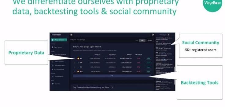 我們的秘密就是我們的專有數據,例如交易所的訂單簿和未平倉交易數據。這些數據我們已經收集了兩年多了,是其他地方是找不到的,甚至是交易所本身也找不到。由于擁有全面的歷史數據集,Viewbase是唯一一家能夠讓用戶通過回測其期權期貨戰略來做明智決定而不是依賴直覺的平臺。當用戶加入平臺后,我們會將他們納入5000人的社交大群里,留住這些用戶,然后隨著我們的成長來產生網絡效應。