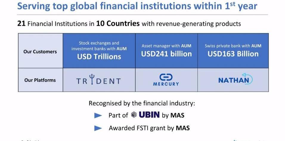 Trident是一個已經上線的平臺,讓我們的客戶,國家證券交易所和投資銀行,能夠針對債券、股權、基金和資產支持證券創建智能合約并即時結算。Mercury平臺讓我們在資產管理領域的客戶能夠對交易實時對賬;消除95%的人工流程。Nathan平臺幫助我們的私人銀行客戶利用智能合約技術來管理結構化產品,能夠削減68%的人工作業。此外,作為對我們的創新的認可,我們被選為新加坡央行國家區塊鏈計劃Ubin的項目之一。我們還獲得了新加坡央行提供的FSTI資金,這個項目將會支付我們的平臺開發費用,因為央行認可了它對行業的價值。這些平臺讓我們在第一年就實現了創收,獲得了多家金融機構客戶。我們的收入模式簡單且可擴展。這種模式基于我們的經常性收入:根據交易的性質,我們抽取交易價值的0.5個基點或者每筆交易2-50美元。憑借已經上線的平臺、客戶和收益,我們目前已經準備好進行進一步擴張。