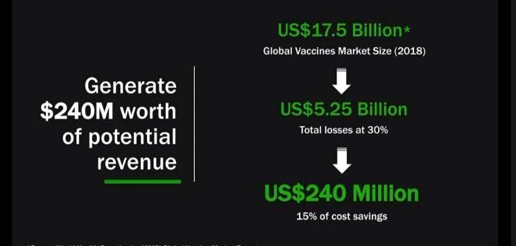 我們能做出多少價值?現在,全球疫苗市場規模為175億美元,其中UNICEF和Gavi占50億美元。根據我們能將總損失減少一半的經驗,我們希望僅僅從這兩個合作伙伴處就獲得2.4億美元的價值。