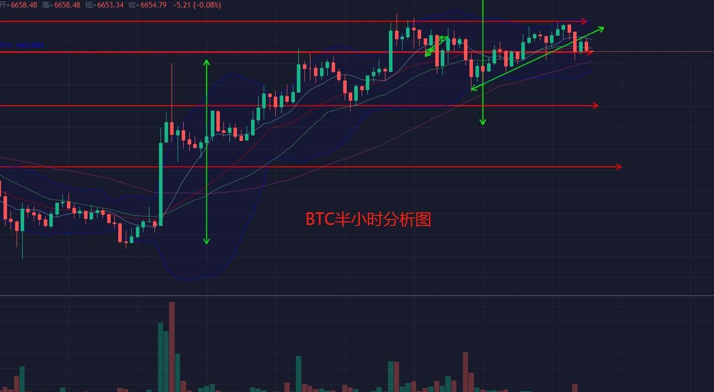 BTC昨日大餅價格延續上一日走勢,繼續走震蕩上行趨勢,并強勢突破6400,6600兩個重要壓力位,在6800一線上漲情緒得到緩解,晚盤價格開始震蕩下行,回踩6500一線壓力位。今日分析:今日開盤價格從6500一線繼續震蕩上行,欲再次突破6800強壓位,但在兩次強勢突破,但最終未果之后,價格開始下跌,從目前半小時k線圖分析,此時價格已跌破上行通道支撐位,今日需注意的幾個重要點位6800,6650,6500,激進的投資者可以在此區間選擇高拋低吸入場操作,前期仍然以主控思路操作,當價格再次給到6450~6400一線,則可以選擇多單入場操作,若價格直接有效突破6800一線,則可以選擇順勢多單入場。