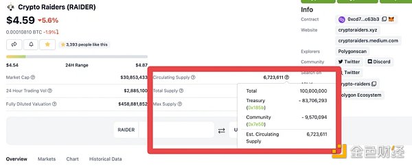 相比之下,項目代幣更是復雜。舉個例子。對于 Crypto Raiders,我們已經釋放了 1億總供應量中的大約 1600萬 個。但是如果我們打開 Coingecko查看,上面顯示流通供應量只有 6,723,611。其余的在哪里?