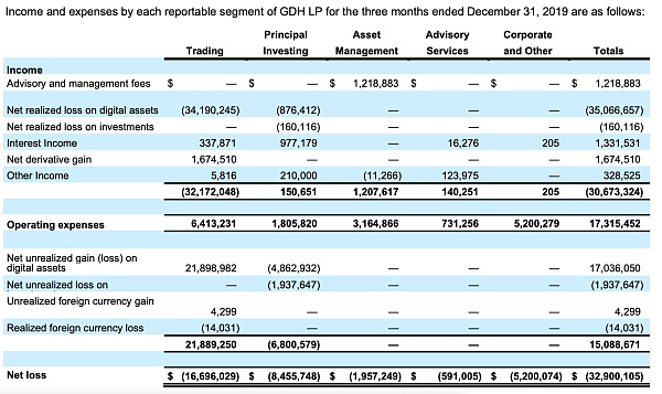 Galaxy Digital 2019年第四季度財報顯示,Galaxy Digital在2019年第四季度凈虧損3290萬美元,其中交易部門凈虧損約為1669.6萬美元,投資部門凈虧損845.8萬美元。