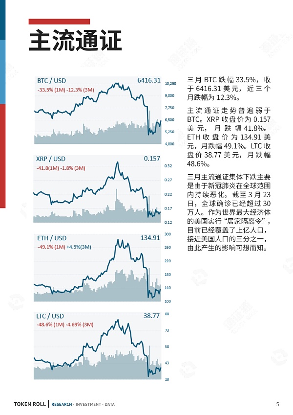 三月主流通證集體下跌主要是由于新冠肺炎在全球范圍內持續惡化,多國經濟活動受到重大影響,市場恐慌情緒飆升,全球主要金融市場均出現暴跌,數字通證市場也無法獨善其身。