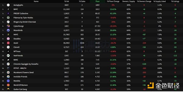 在過去的一周里,我們看到整體 NFT 市場處于橫盤的狀態,但是仍然有一些 NFT 的地板價有所上升,讓我們看看下面的截圖。