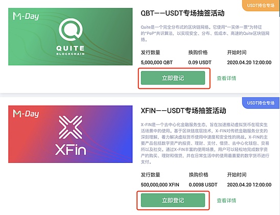 QBT/USDT交易對上線時間為4月20日20:00,XFIN/USDT上線時間為4月21日20:00。所以,千萬記住,QBT和XFIN的抽簽時間可同時進行,交易則錯開了一天。