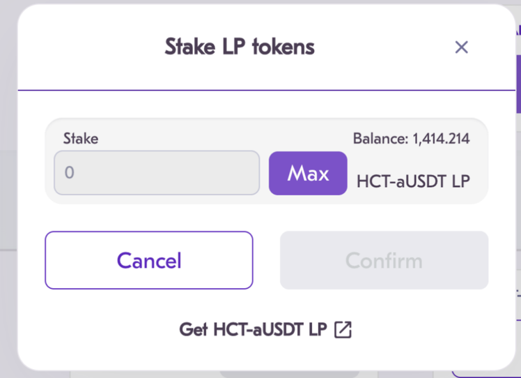 欲參與 Farm 獲取流動性挖礦收益,請先在 HurricaneSwap 中為指定的交易對提供流動性,并獲取相應的 LP-Token您可以點擊「Get HCT-*LP」,跳轉到相關 Token 的 Add Liquidity 頁面。