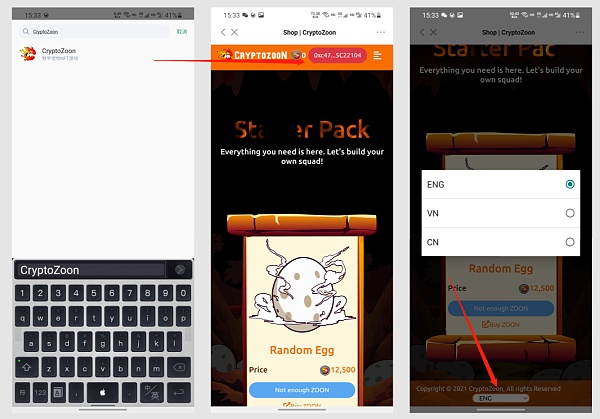 將錢包切換至BSC公鏈,進入發現頁,找到CryptoZoon,或直接在搜索欄搜索CryptoZoon,進入后DAPP會自動連接錢包,首頁默認是引導去買蛋,孵化寵物,頁面最下方可以切換語言為中文,