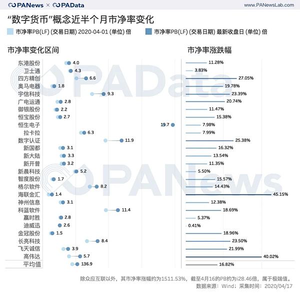 受多重利好消息刺激,除了“數字貨幣”概念股的股價在近期不斷攀升外,其估值也在上漲。根據統計,4月1日至4月16日期間,27只“數字貨幣”概念股的市盈率(每股股價與每股收益的比率)從平均49.3倍上漲至平均56.4倍,漲幅達到12.78%。