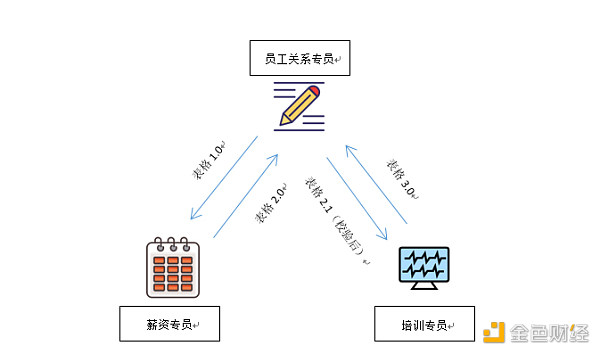 在這個周期內,員工關系專員負責整理新入職人員信息與離職人員情況,更新員工信息表格,然后將維護好的表格(表格1.0)發送給薪資專員。薪資專員收到表格后,會留存一份表格1.0的原始版本以備核對,然后在表格1.0的基礎上更新保險、薪資情況,創建表格2.0,并將表格2.0發回給員工關系專員。