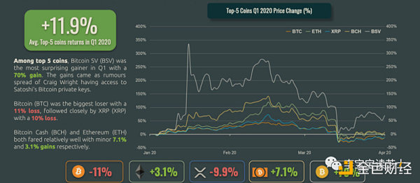 a. 以一季度為時間維度來看Top 5加密貨幣價格表現,比特幣最為糟糕,價格下跌11%,BSV最好,價格上漲70%,ETH和BCH以+3.1%和+7.1%居中;
