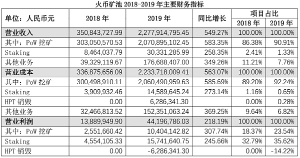 這一點從火幣礦池的營業收入就可見一斑。據今年3月火幣礦池發布的財務數據顯示,2019年火幣礦池營業收入22.78億元,同比增長了549.27%,其中營業利潤4419.68萬元,同比增長218.19%。