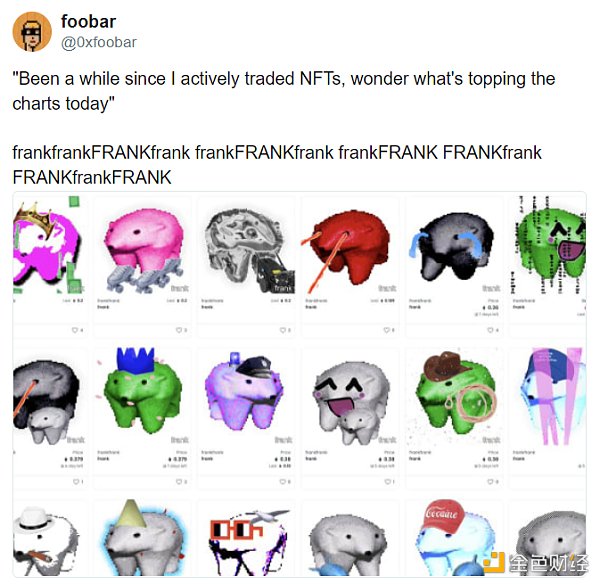 維基百科將 shitposting 描述為在網上發布“具有攻擊性、諷刺性、低質量”的內容。一天前啟動的 frankfrank 項目,代表了 shitpost NFTs 的蓬勃發展,或者至少是這種類型決定性地進入 NFT 生態主流的象征。這個項目很難解釋,因為實際上沒有什么可解釋的,但是自項目發布以來,圍繞 frank NFTs 的近 2000 ETH 的交易本身就說明了問題。不要對真正奇怪事物視而不見。