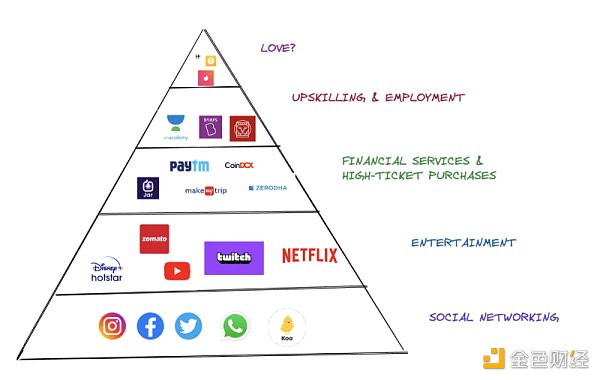 消費模式幾乎在非常寬松的意義上遵循馬斯洛夫的層次結構。在這種情況下,人們從滿足他們的基本需求開始——一個可以花費他們注意力的地方。然后,沿著弧線往上走,為交易和儲蓄提供金融服務,還有一小部分向教育或提高技能的方向發展。我嘗試根據上述數據制作馬斯洛夫的需求層次結構。