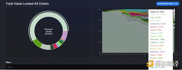 2016 年 ETC 分叉時,Tether ( USDT ) 的市值僅為 0.65%,穩定幣剛開始走入人們的視野,以太坊鏈上生態還未起步,無需考慮智能合約和代幣問題,而且技術上實現難度也比較低。而如今,不僅穩定幣成為一種廣泛的鏈上資產,其中明確支持合并的 USDT 與 USDC 就占到了整個加密市值 10.6% 以上。而且以太坊還坐擁 389 億美元 TVL,擁有最為龐大的生態網絡,目前以太坊主網上部署的智能已經多達 5120 萬個,即使是現在處于熊市的非活躍期,目前依舊在以每周 5-6 萬個新增智能的速度增長。