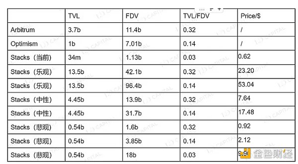 使用當前以太坊 Layer 2 項目 Arbitrum 和 Optimism 的 TVL/FDV 值作為參考值,可以對 Stacks 進行估算。
