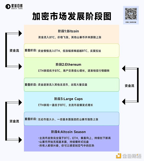 根據過往行情走勢,Odaily星球日報將市場發展分為四個階段:第一階段,資金流入 BTC,價格飛漲,其他山寨幣并未跟隨上漲,出現吸血行情,用戶對「牛回」的信心并不充足,依然處于觀望狀態;第二階段,資金緩慢流向 ETH,二者匯率反復拉扯,最終 ETH 走勢開始逐漸強于 BTC,市場信心回暖,用戶開始逐漸相信行情回暖;第三階段,資金開始逐漸流入一些市值較大的主流幣,這些項目開始釋放各種基本面利好,例如新故事、新概念、減半等,實現價格大幅拉升,并且這一階段 ETH 表現始終猶豫 BTC;第四階段,一些基本面強勁的代幣開始率先上漲,此后各種山寨幣無視基本面瘋狂拉盤,市場徹底進入狂熱階段。