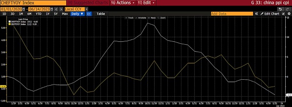 中國生產者指數(白色)和消費者價格指數(黃色)