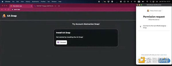 1 )在 AA Snap 官網 連接 MetaMask 錢包,接著會在 MetaMask 中彈出請求連接的窗口,點擊連接